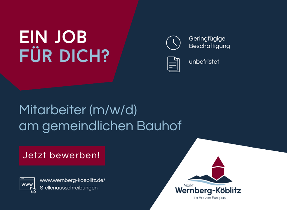 Der Markt Wernberg-Köblitz sucht zum nächstmöglichen Zeitpunkt einen Mitarbeiter (m/w/d) in geringfügiger Beschäftigung am gemeindlichen Bauhof.